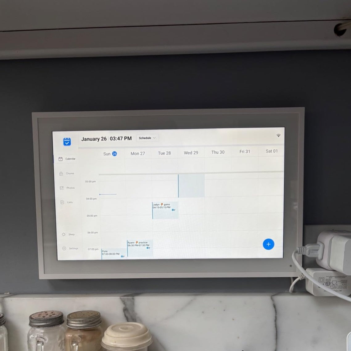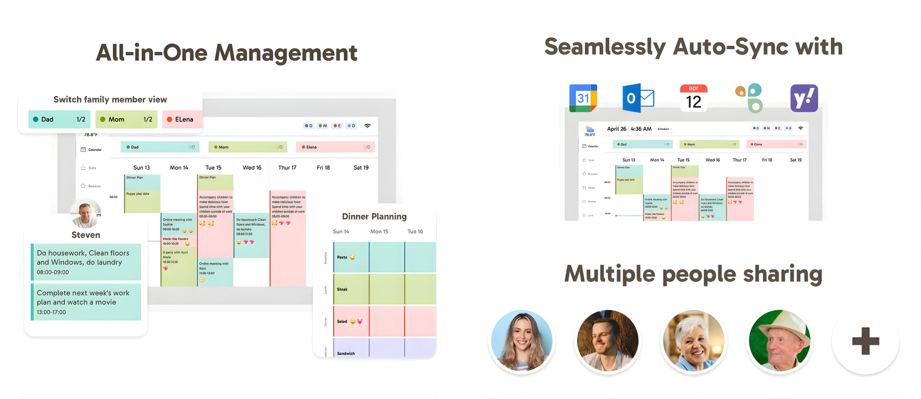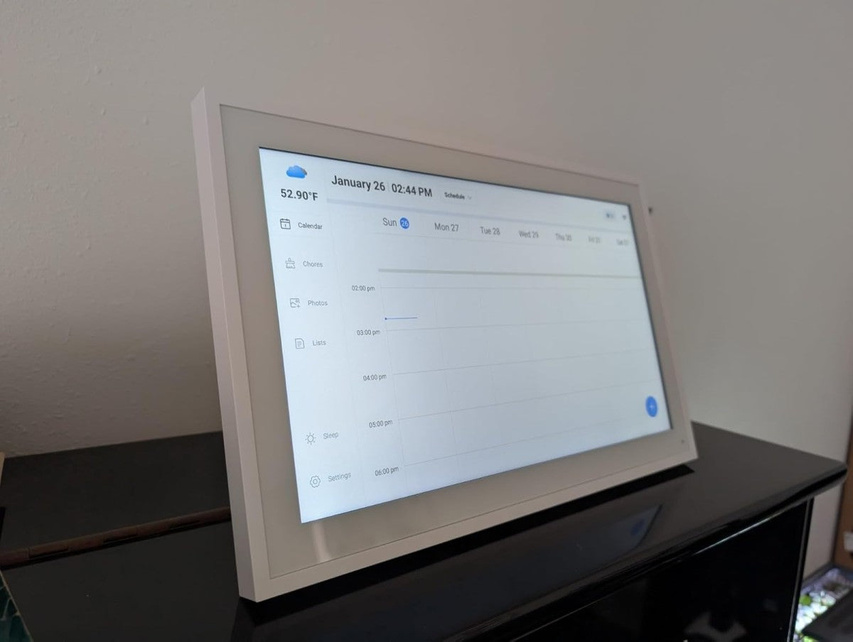 Works with the FotoCube app for iOS and Android. The app is required to manage and update one or multiple smart calendars, including photos, schedules, and reminders.
