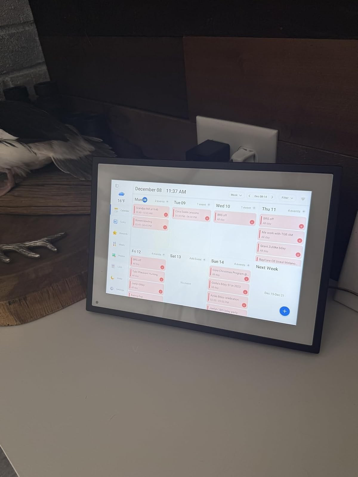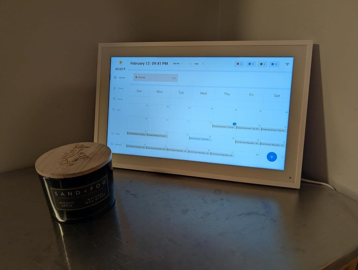 Smart calendar frame, power adapter, stand, and user manual.